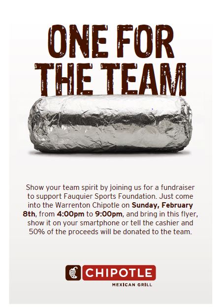On Tuesday, September 9th, from 5:00pm to 9:00pm. take the whole family out to eat at Chipotle. 50% of all proceeds from sales during the time frame 5pm-9pm for anyone who presents the flier at Chipotle will go towards the Fauquier HS. weight room.. The link below is the "School Spirit Tastes Great” flier that you will need to print out or show it on your smart phone.